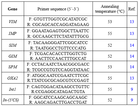 The DNA of P. aeruginosa isolates positive in the DDST was extracted using a DNA extraction kit as instructed by the manufacturer (Sigma-Aldrich, St Louis, MO). Subsequently, the frequency of β-lactamase genes (bla-VIM, IMP, AMPC, SIM, GIM, SPM, OXA10, and OXA2) and int1 and Int2 integron genes was determined in strains using PCR with specific primers as shown in Table 1. PCR was carried out in 25 µl PCR volumes containing 10 ng template DNA, 0.5 mM of dNTPs, 10 pm of each primer, and 1 µl of Taq DNA polymerase in 1x PCR buffer. DNA amplification was performed in a Mastercycler Personal thermal cycler (Eppendorf, Germany) based on cycling parameters described in Table 1. PCR products were analyzed in 1% agarose gel containing 25 μg of ethidium bromide in tris-ethylenediaminetetraacetic acid (EDTA) buffer, and the gel was photographed under an ultraviolet illuminator using a gel documentation system and confirmed by sequencing.
