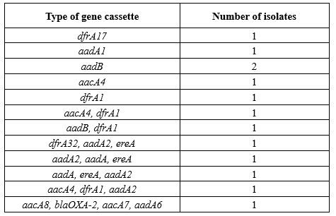 The high frequency of aminoglycoside resistance gene cassettes in class 1 integrons has been reported in several studies. In a previous report, different aminoglycoside resistance genes, including aadA1, aadA2, aadA5, aadA6, aadB, accA4, and aac(6)-IIa, and three bla genes blaOXA10, blaP1, and blaCARB-8 were identified in integrons structure (25).