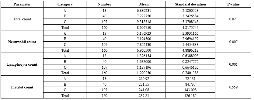 The present study investigated the mean differences of various hematological parameters among participants with different severities of COVID-19. The mean total count and mean neutrophil count were found to be significantly higher among Category C patients. The mean lymphocyte count was significantly lower among participants in Category C. Platelet count showed no statistically significant difference among the three categories of COVID-19 (Table 4).